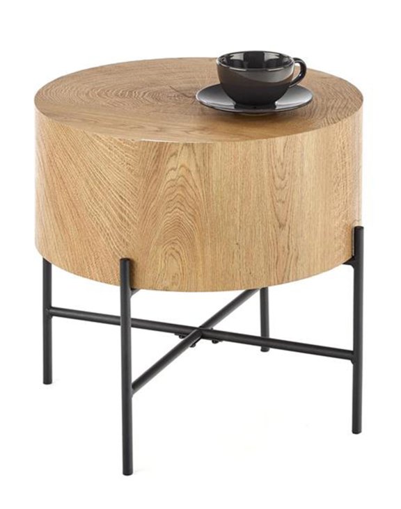 Blatul rotund este acoperit cu o granulație fină, ceea ce sporește farmecul măsuței și îi conferă aspectul unui lemn natural de culoarea stejarului.