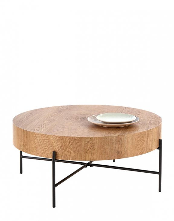 Blatul rotund este acoperit cu o granulație fină, ceea ce sporește farmecul măsuței și îi conferă aspectul unui lemn natural de culoarea stejarului.