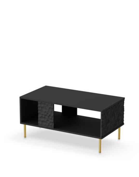 Culoarea negru îi conferă măsuței eleganță și rafinament, introducând, de asemenea, un contrast subtil în design-ul încăperii. Decorul 3D sub formă de gravuri pe partea frontală și pe părțile laterale îi conferă un caracter și o profunzime aparte piesei de mobilier, creând un efect vizual de designer.