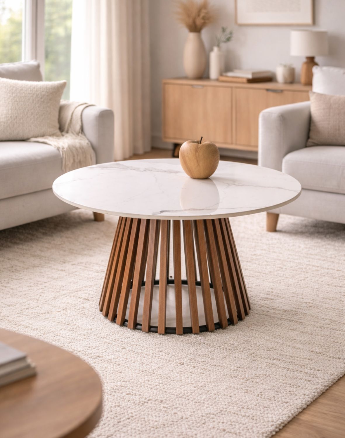Blatul rotund este realizat din piatră sinterizată, un material care imită marmura naturală cu fidelitate, dar care oferă o durabilitate superioară, într-o nuanță delicată de bej cu vene subtile.