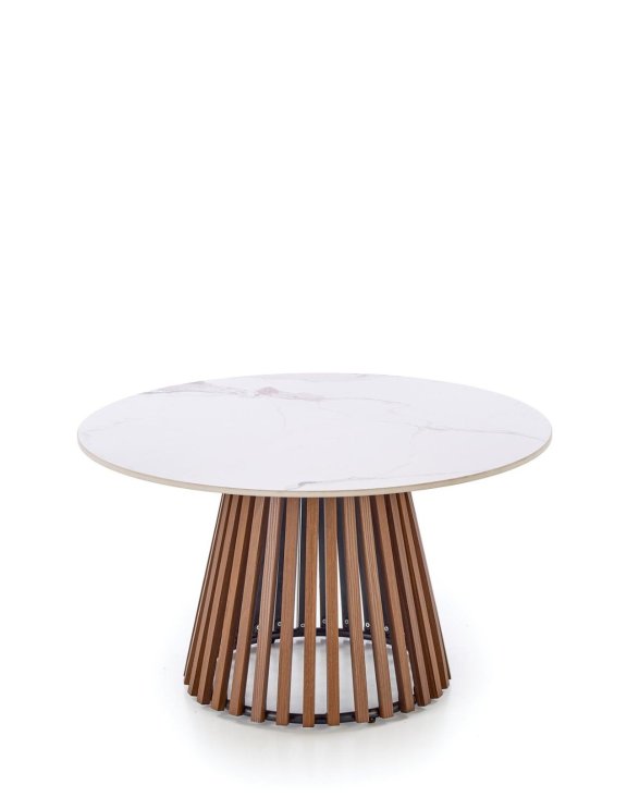 Baza mesei este aerisită, fără a-i compromite soliditatea și stabilitatea. Realizată din MDF furniruit într-o culoare profundă de nuc, aceasta prezintă lamele decorative care îi adaugă interes vizual și textură.