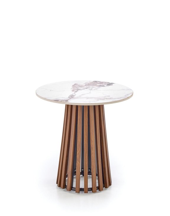 Baza mesei este aerisită, fără a-i compromite soliditatea și stabilitatea. Realizată din MDF furniruit într-o culoare profundă de nuc, aceasta prezintă lamele decorative care îi adaugă interes vizual și textură.