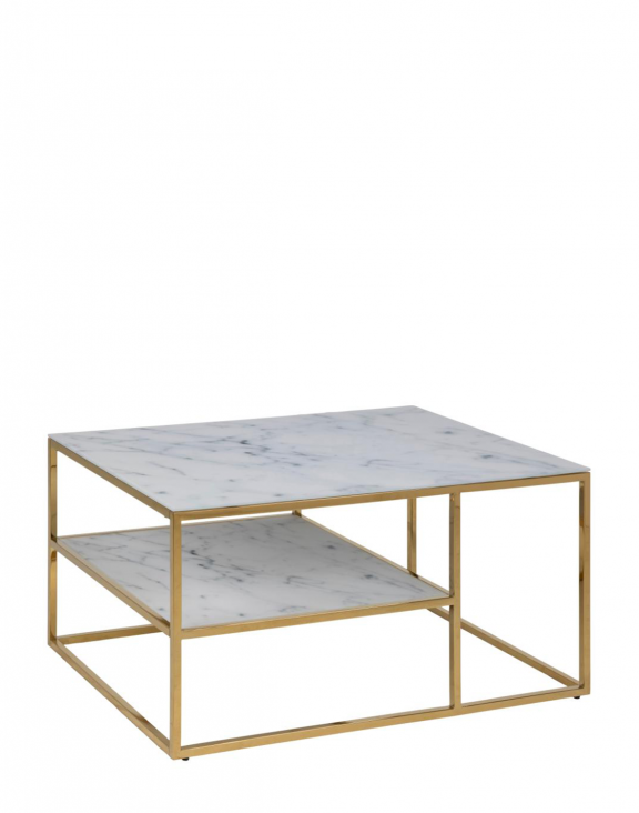Măsuța este dotată cu două blaturi realizate din sticlă cu o grosime de 6 mm în culoarea marmură albă.