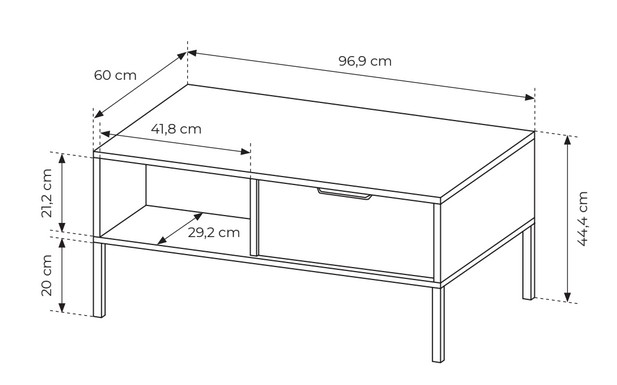 Comoda dezvăluie o compartimentare inteligentă, având două compartimente generoase cu rafturi interioare și un sertar compacte dotate cu glisiere cu extindere completă pentru o utilizare lină.