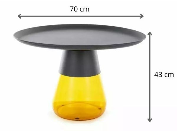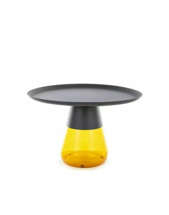 Blatul din metal negru mat se sprijină pe o bază impresionantă din sticlă colorată într-o nuanță de oranj.