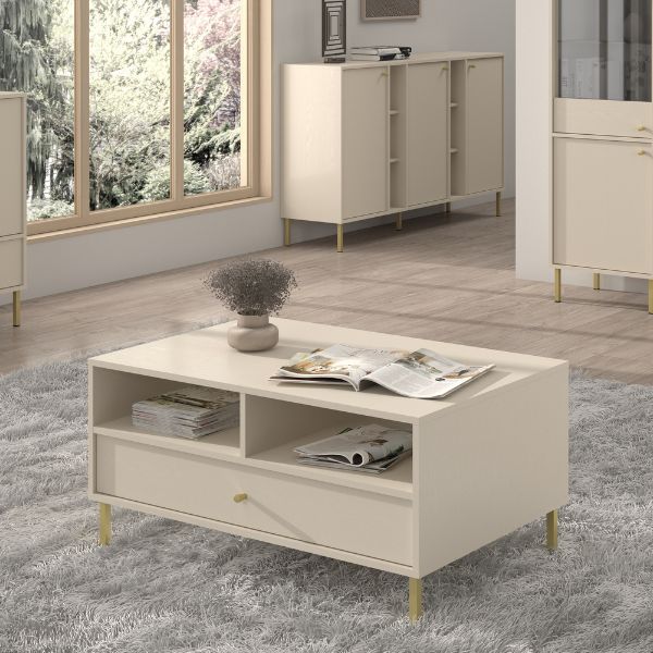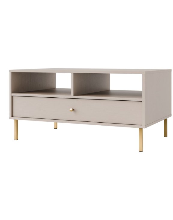 Măsuța cu sertar și 2 rafturi deschise Tokyo 2, în culoarea bej nisipiu, de la Stolarz Lempert, va aduce un suflu nou în amenajarea casei tale.