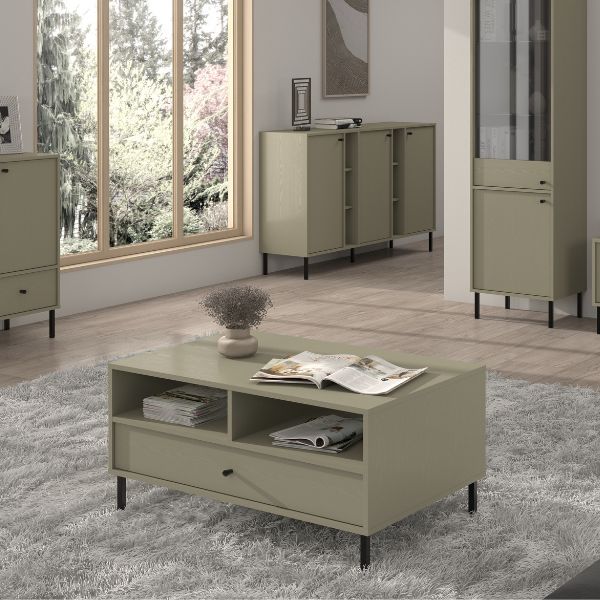 Măsuța cu sertar și 2 rafturi deschise Tokyo 2, în culoarea verde eucalipt, de la Stolarz Lempert, va aduce un suflu nou în amenajarea casei tale.