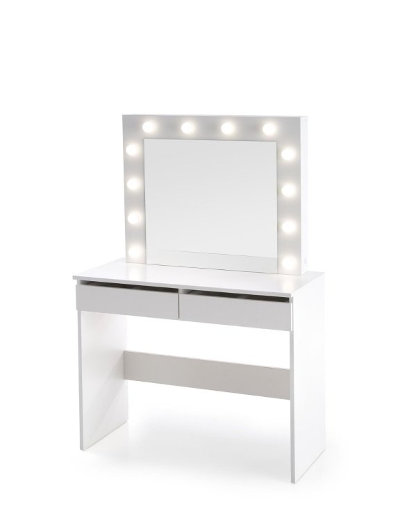 Măsuța de toaletă cu oglindă Hollywood, în culoarea alb, de la Halmar, combină designul luxuriant cu soluțiile practice.