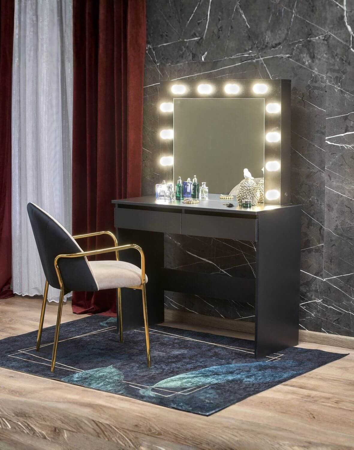 Poate fi amplasată în dormitor, sufragerie sau dressing pentru a crea un colț de înfrumusețare deosebit.