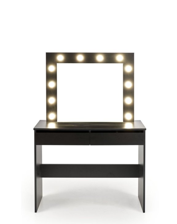 Măsuța de toaletă cu oglindă Hollywood, în culoarea neagră, de la Halmar, combină designul luxuriant cu soluțiile practice.
