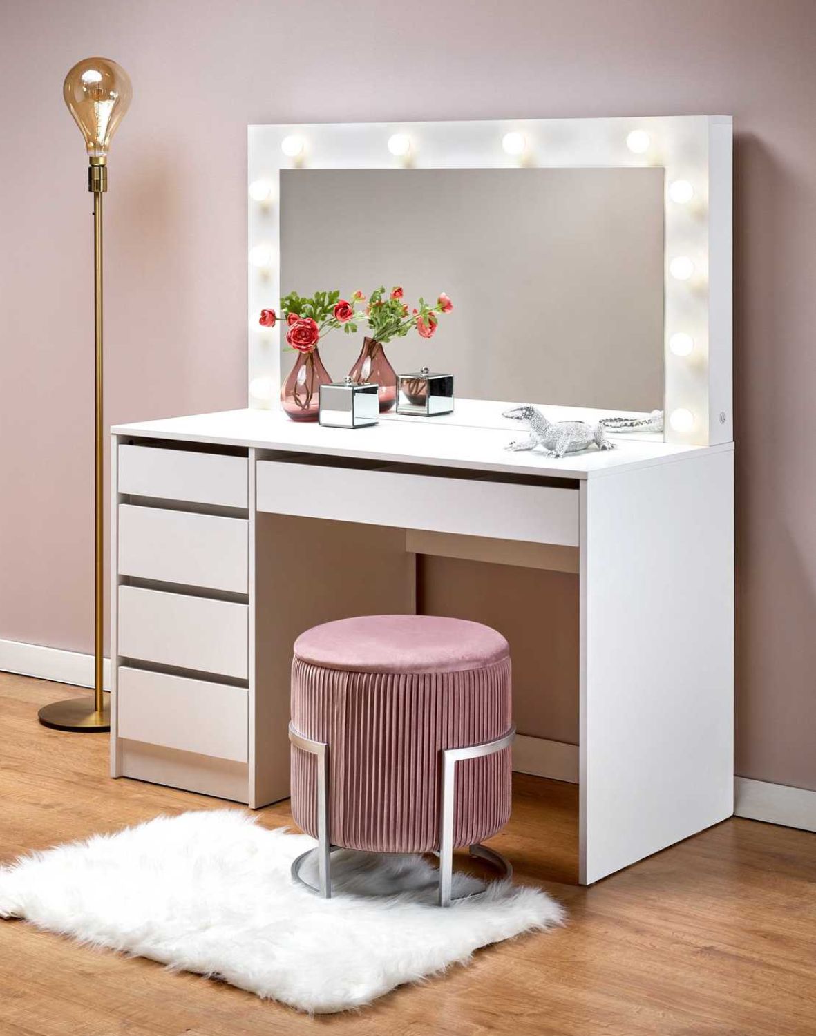 Măsuța de toaletă cu oglindă Hollywood XL, în culoarea alb, de la Halmar, combină designul luxuriant cu soluțiile practice.