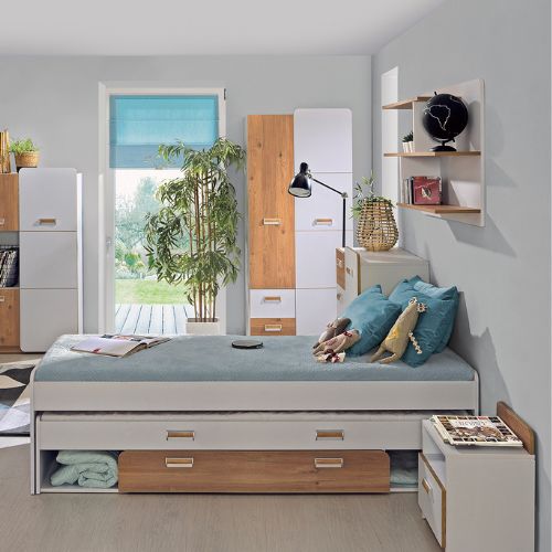 Noptiera Lorento L12, în culorile alb și stejar nash, de la Dolmar, combină estetica nordică cu funcționalitatea sporită, perfecte pentru camera unui copil sau adolescent, sau chiar pentru un dormitor liniștit.