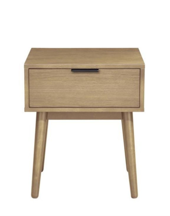 Blatul și sertarul sunt realizate din MDF furniruit, în timp ce picioarele sunt realizate din lemn masiv de cauciuc în culoare naturală sau de nuc.