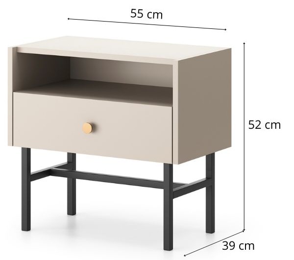 Un sertar spațios și un raft deschis – ideale pentru telefon, încărcător și o carte.