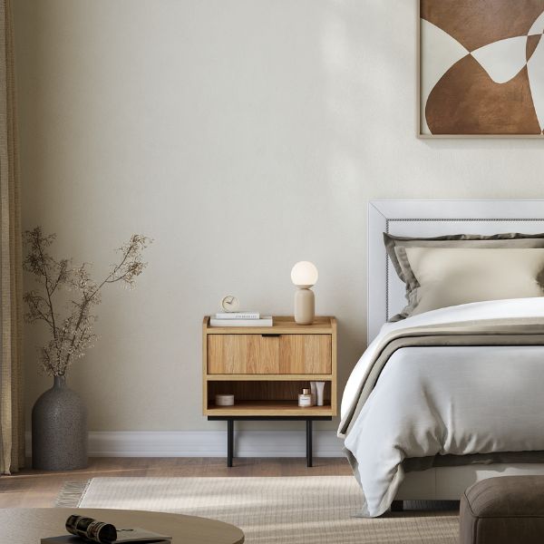 Noptiera cu sertar și raft Edison, în culoarea stejar hikora, de la Karol, este o soluție de depozitare care combină perfect designul elegant și un grad ridicat de funcționalitate.