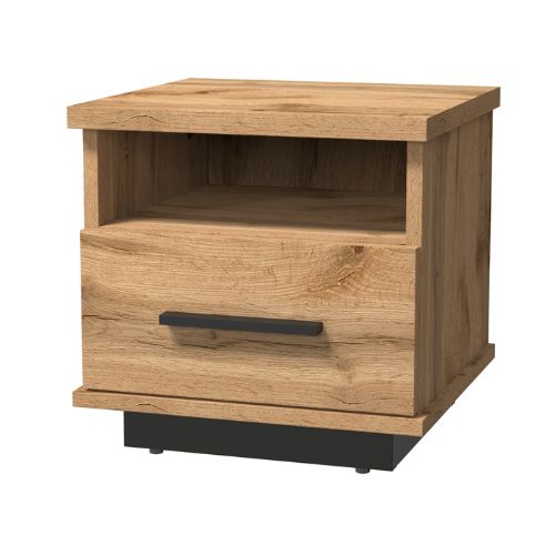 Noptiera dispune de un sertar și un raft deschis, fiind o soluție ideală de depozitare pentru obiectele necesare lângă pat.