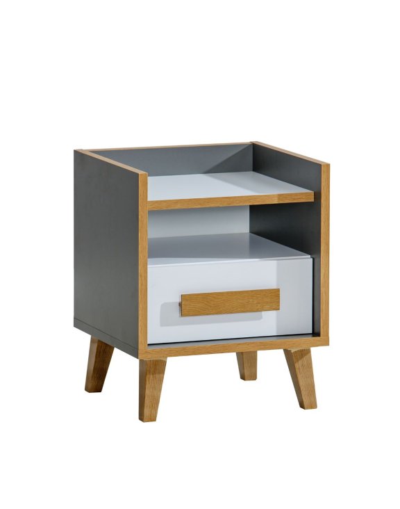 Este dotată cu un blat adânc, un sertar compact și un raft deschis pentru depozitarea obiectelor necesare lângă pat, precum telefonul sau o carte.