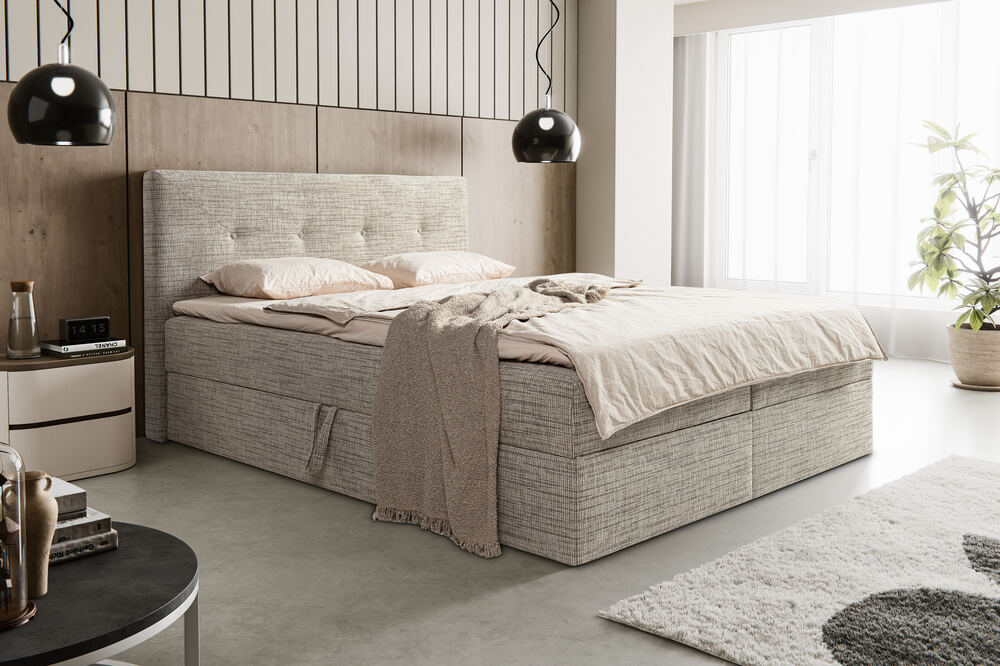 Fiind un pat continental, este format din mai multe straturi, o bază integrată cu arcuri, salteaua propriu-zisă și un topper opțional, asigurându-ți un nivel ridicat de confort și ergonomie.