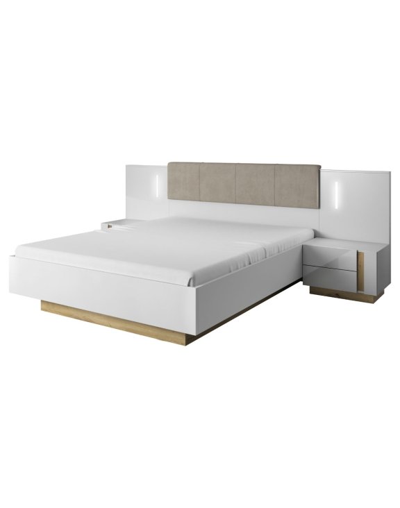 Pat cu spațiu de depozitare, noptiere și iluminare LED Arco, alb/stejar grandson (160x200 cm)