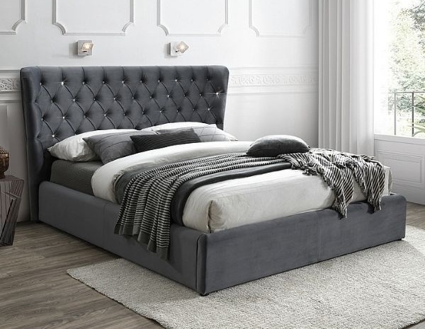 Tăblia matlasată încântă prin strălucirea delicată a pietrelor, țesătura catifelată și proporțiile echilibrate, atrăgând toate privirile într-un dormitor elegant.
