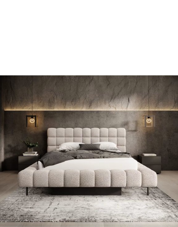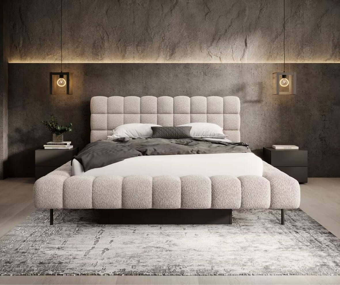 Picioarele înalte și suple din oțel negru îi adaugă o notă de minimalism industrial, echilibrând vizual volumele generoase ale patului.