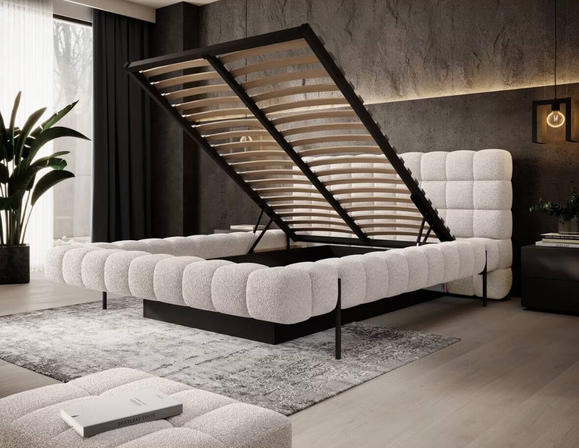 Sub saltea se află un compartiment de depozitare spațios dar discret, perfect pentru pături, perne și alte textile.