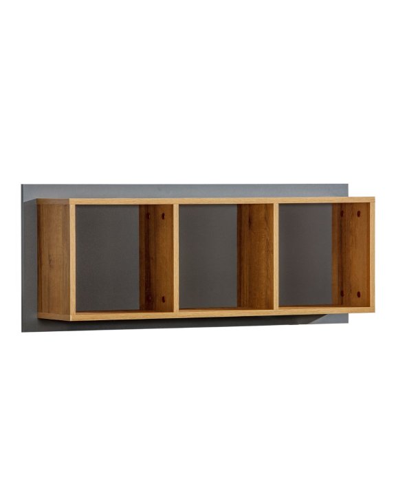 Designul modern este evidențiat de contrastul dintre spatele gri mat și cadrul celor trei spații de depozitare în culoarea stejarului riviera.
