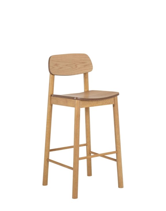 Scaunul de bar Barlow în culoarea stejar natural de la Actona este o piesă de mobilier scandinavă care îmbină minimalismul și funcționalitatea.