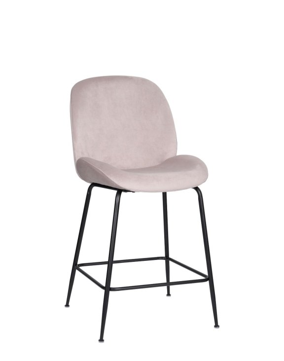 Scaunul de bar este tapițat într-o țesătură de catifea plăcută la atingere, de culoare gri deschis (cu tentă bej), iar picioarele sunt de culoare neagră.