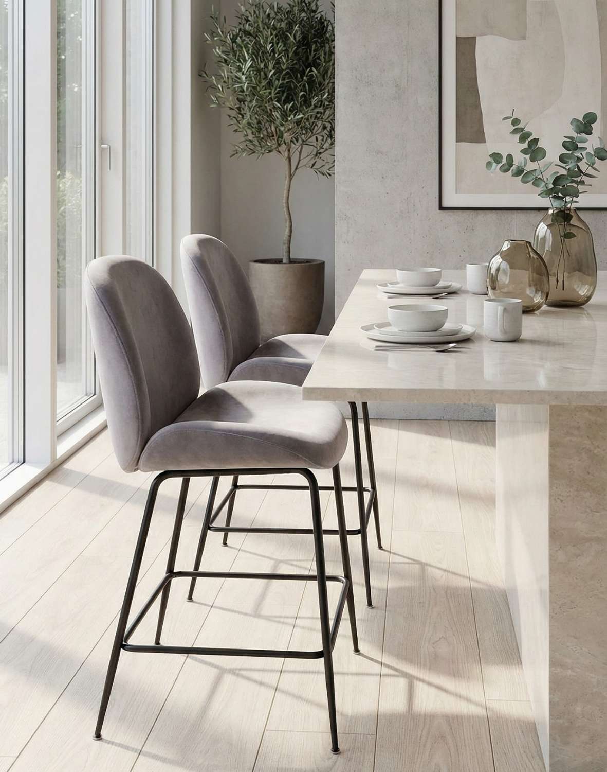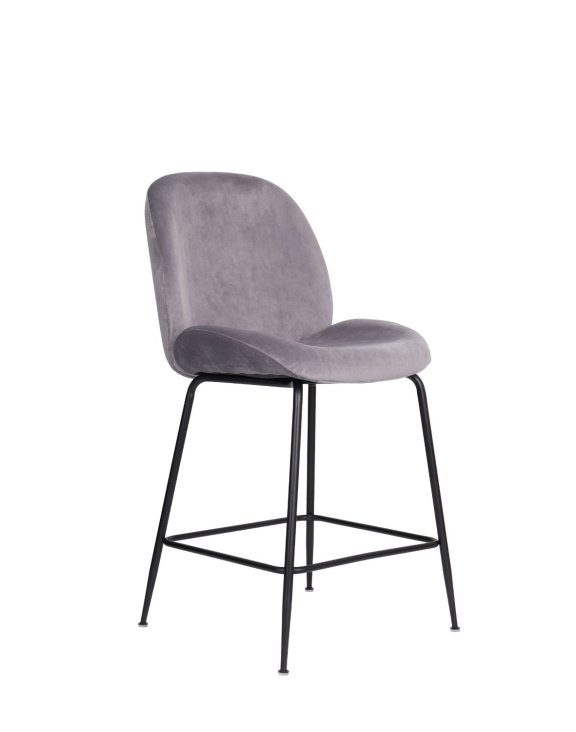 Scaunul de bar este tapițat într-o țesătură de catifea plăcută la atingere, de culoare gri închis, iar picioarele sunt de culoare neagră.