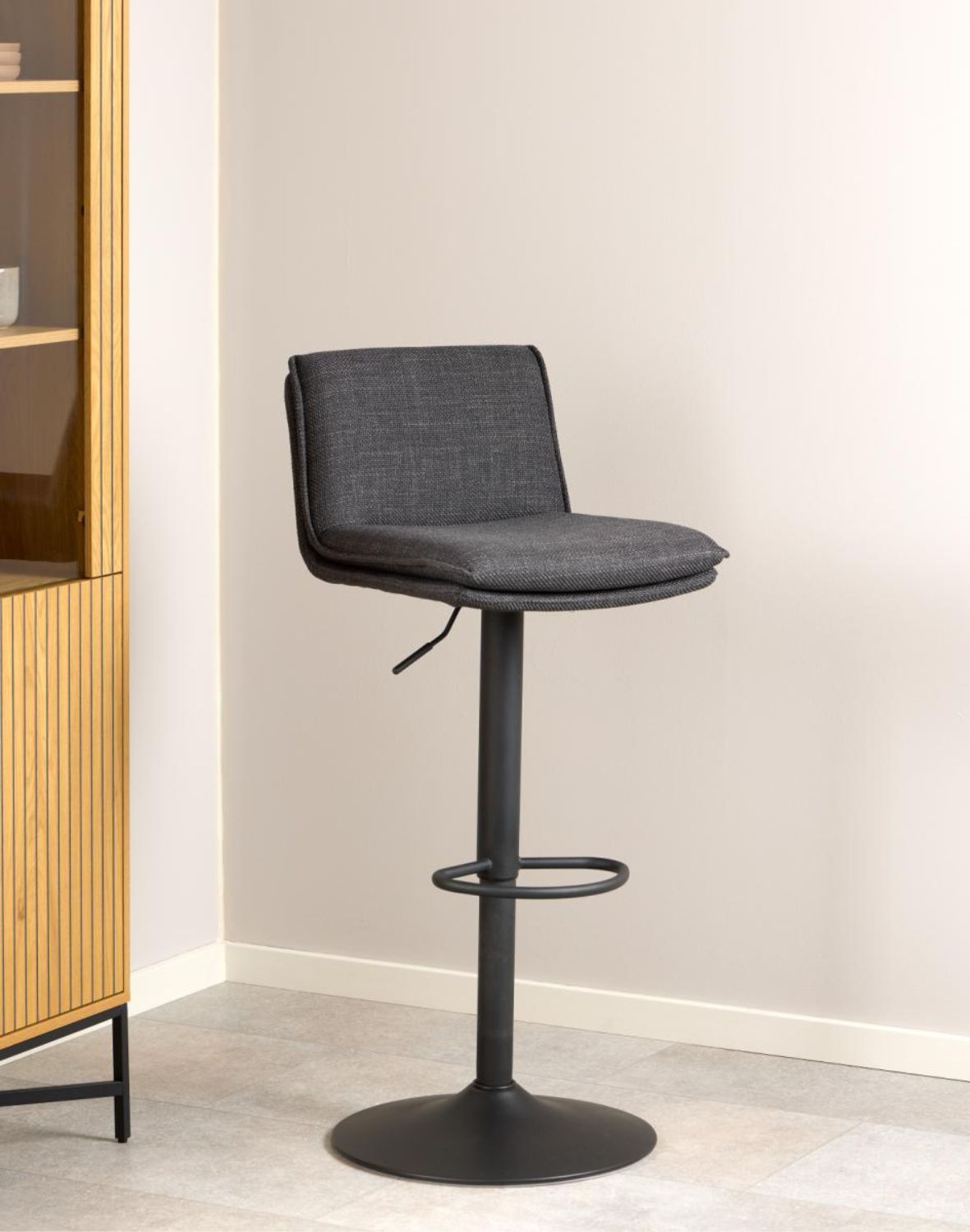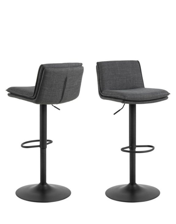 Scaunul de bar Flynn de la Actona, tapițat cu țesătura premium Basel gri închis, are o siluetă clasică și este perfect atât pentru cafeaua de dimineață, cât și pentru băuturile de seară.