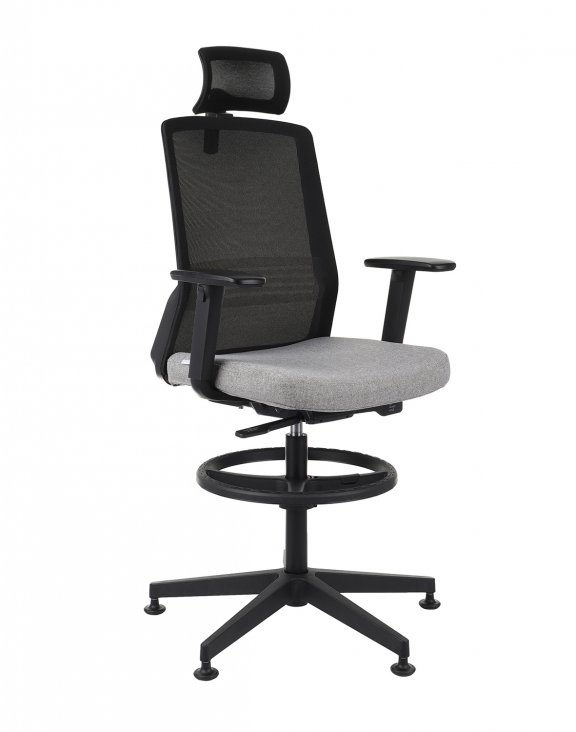 Scaunul de birou ergonomic Coco BS HD RB de la Grospol are un șezut înălțat, un suport pentru picioare reglabil pe înălțime și o tetieră reglabilă.