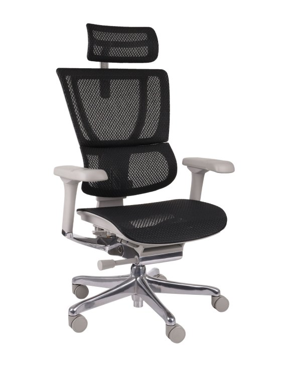 Tetiera, spătarul și șezutul sunt tapițate cu o plasă mesh inovatoare de culoare neagră.