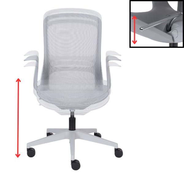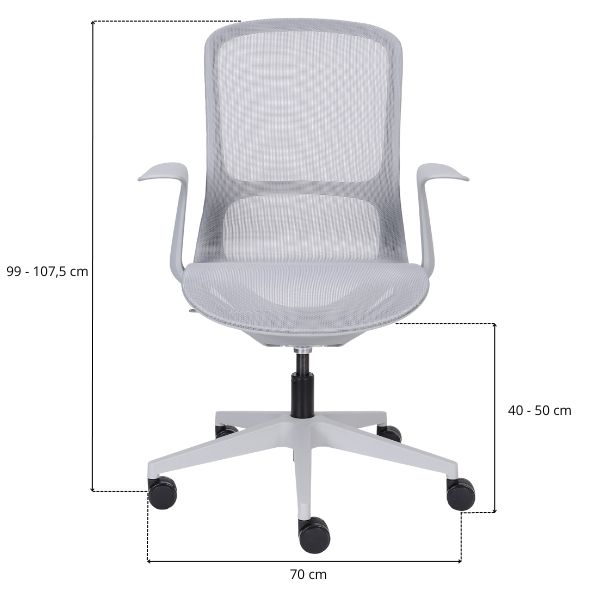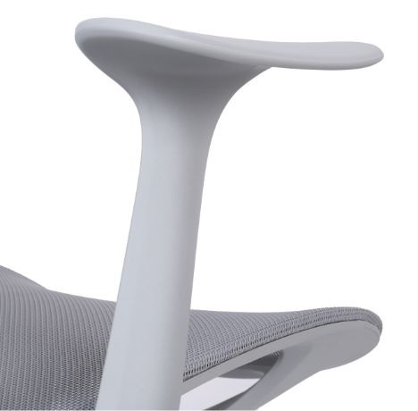 Șezutul și spătarul înalt prezintă o plasă mesh rezistentă și elastică, într-un gri la modă.