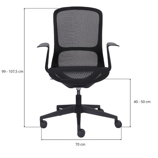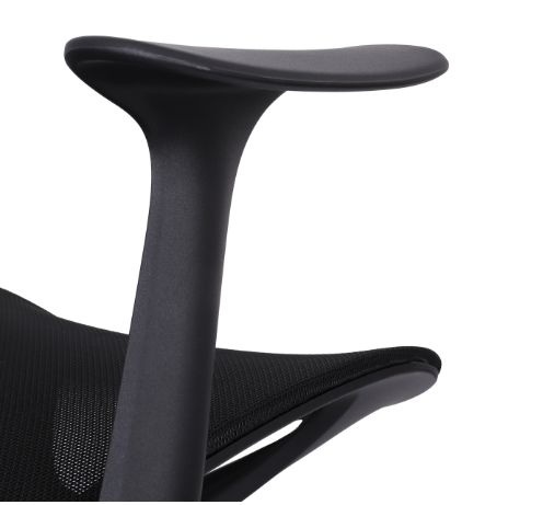 Șezutul și spătarul înalt prezintă o plasă mesh rezistentă și elastică, într-un negru elegant.