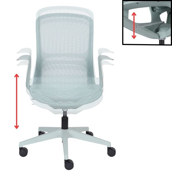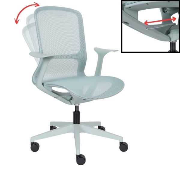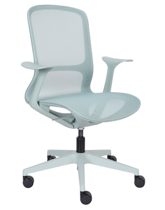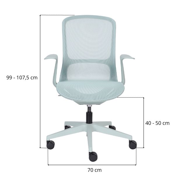 Șezutul și spătarul înalt prezintă o plasă mesh rezistentă și elastică, într-o culoare verde pastel la modă.