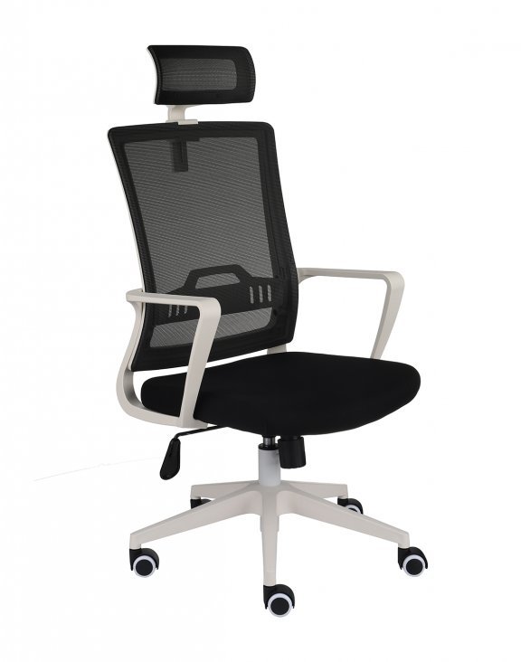 Șezutul este tapițat cu material textil negru, în timp ce spătarul și tetiera sunt tapițate cu plasă, disponibilă în negru.
