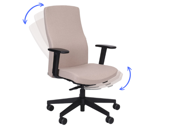 - spătarul se înclină sincronizat cu șezutul (mișcarea spătarului este mai rapidă și mai amplă), oferind în același timp posibilitatea de blocare în 4 trepte, inclusiv în poziția clasică de lucru;