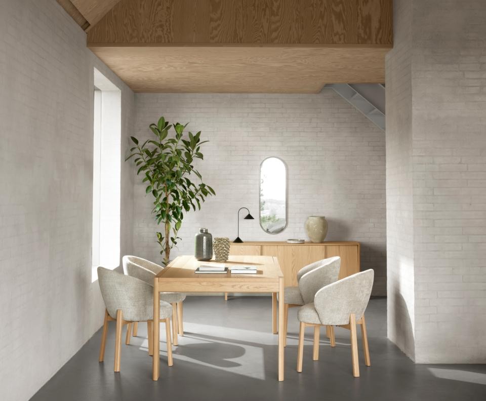 Scaunul de dining Darlene bej cu picioare în culoarea stejar natural de la Actona combină în mod unic eleganța, confortul și designul modern.