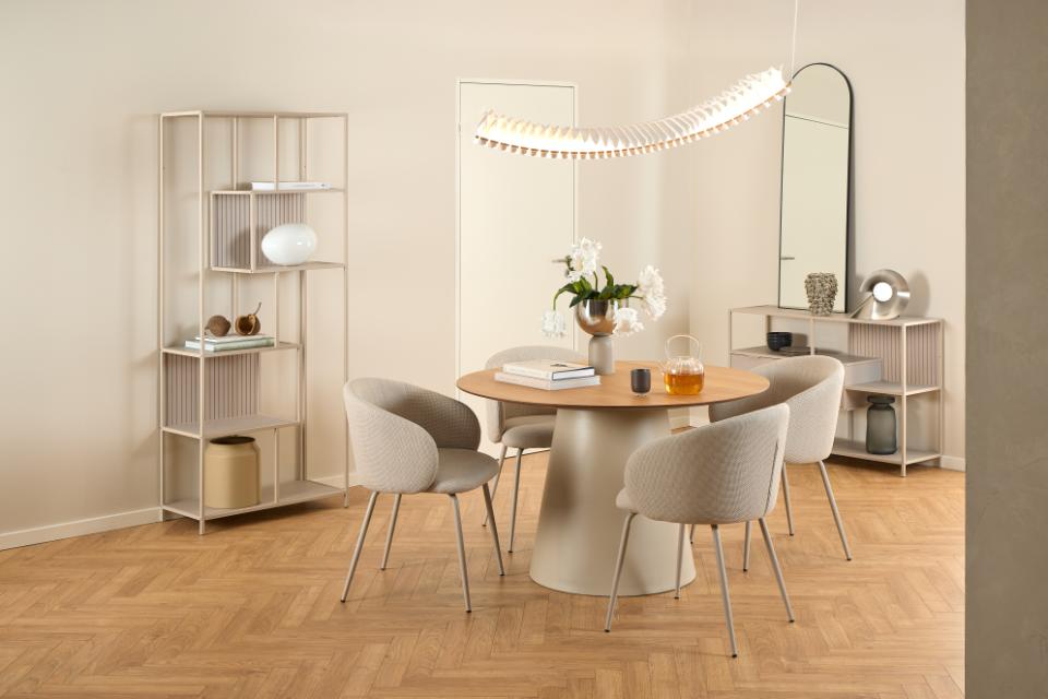 Șezutul ușor rotunjit, cu o formă fluidă, și picioarele suple din oțel acoperit cu pulbere gri creează o siluetă delicată, care accentuează eleganța spațiului interior.