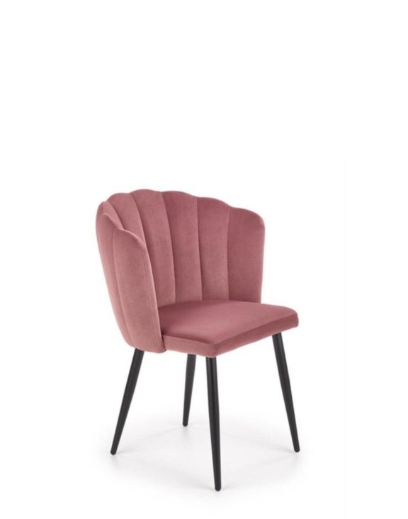 Tapițeria scaunului este confecționată dintr-o țesătură de catifea durabilă și moale la atingere, de culoare roz.