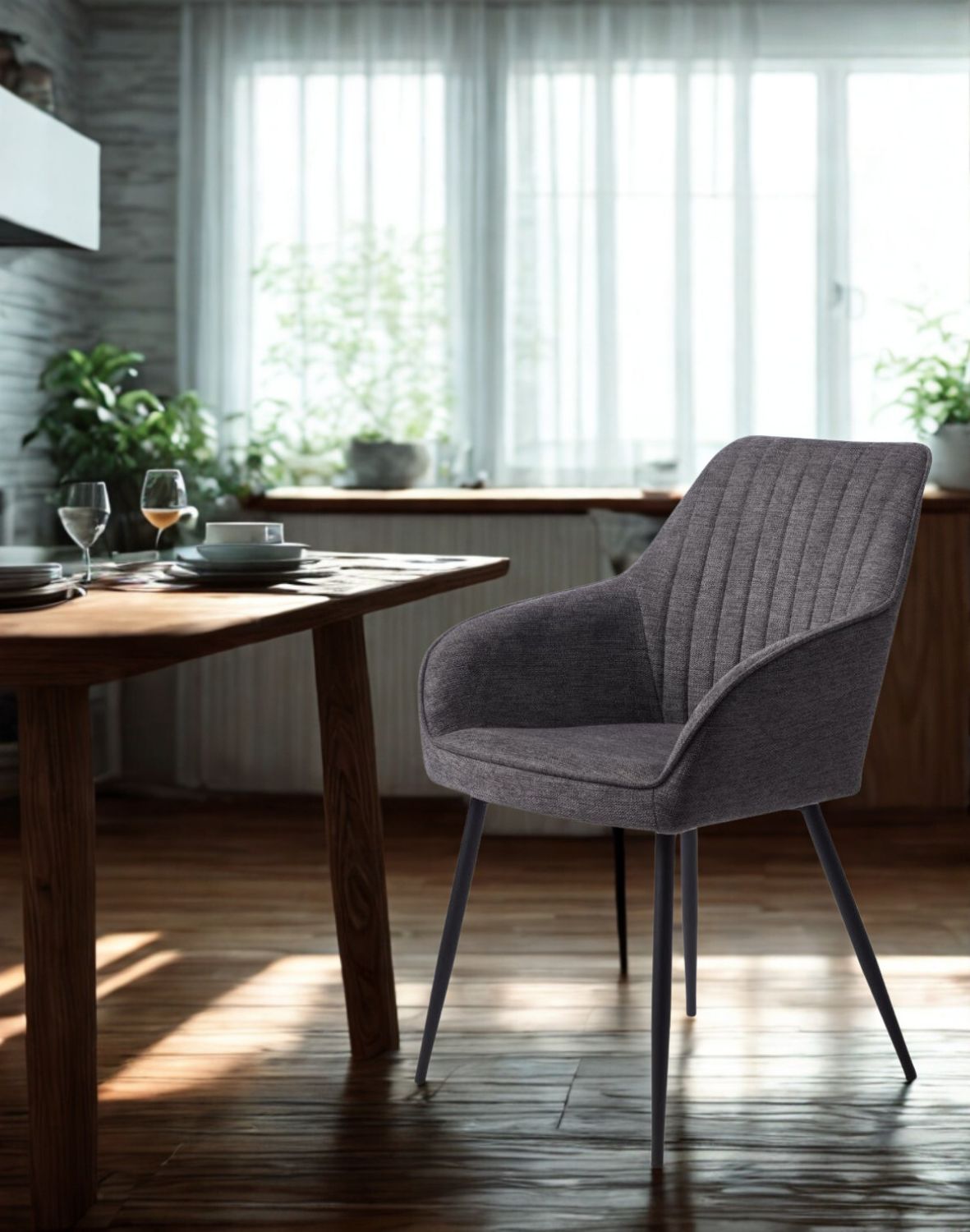 Combinația dintre țesătura texturată și picioarele suple metalice îl face o alegere optimă pentru utilizarea de zi cu zi în sufragerie, dining, birou sau spații comerciale.