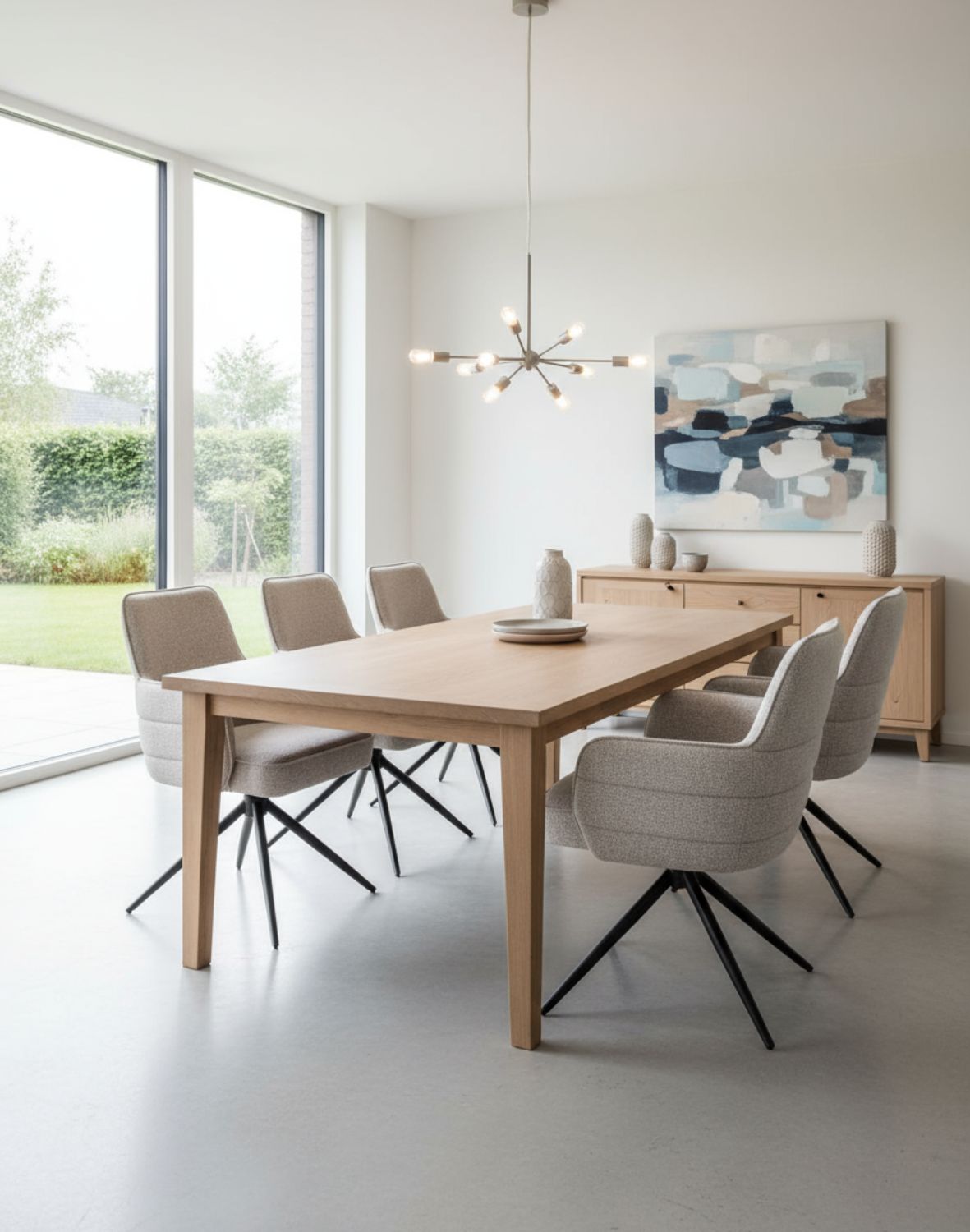 Scaunul de dining pivotant Apollo bej de la Avida Design oferă un confort optim, o libertate de mișcare și un design premium care îi va impresiona pe utilizatori.