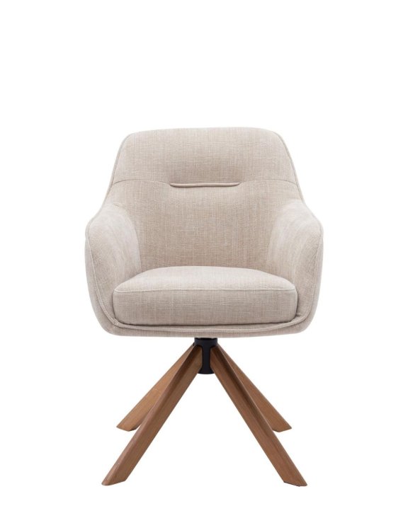 Scaunul de dining pivotant Avola, în culoarea bej și cu picioare din lemn, de la Unique, este o piesă de mobilier elegantă și funcțională care combină designul clasic cu funcționalitatea modernă.