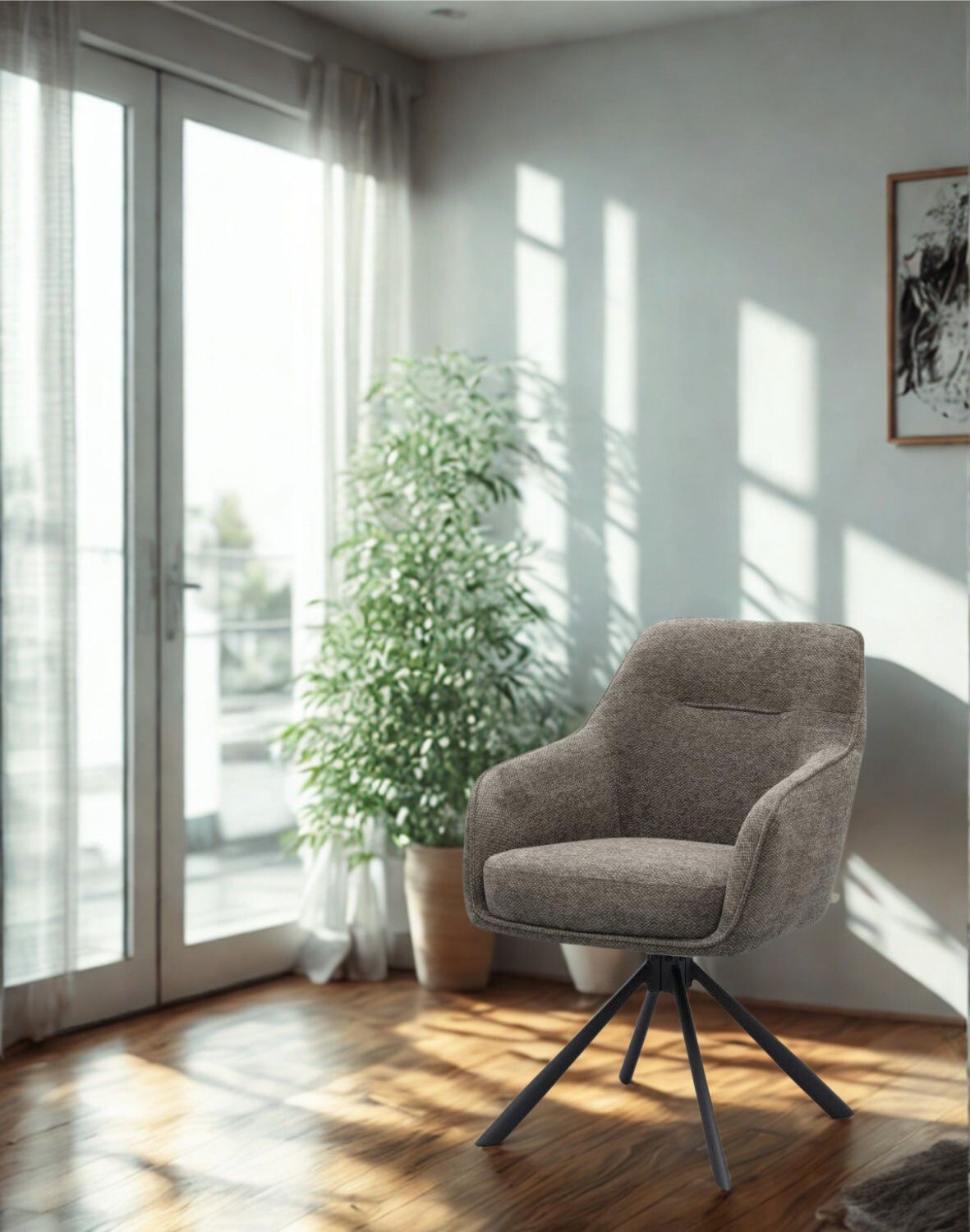 Scaunul de dining pivotant Avola, în chenille grafit și cu picioare metalice, de la Unique, este o piesă de mobilier elegantă și funcțională care combină designul clasic cu funcționalitatea modernă.