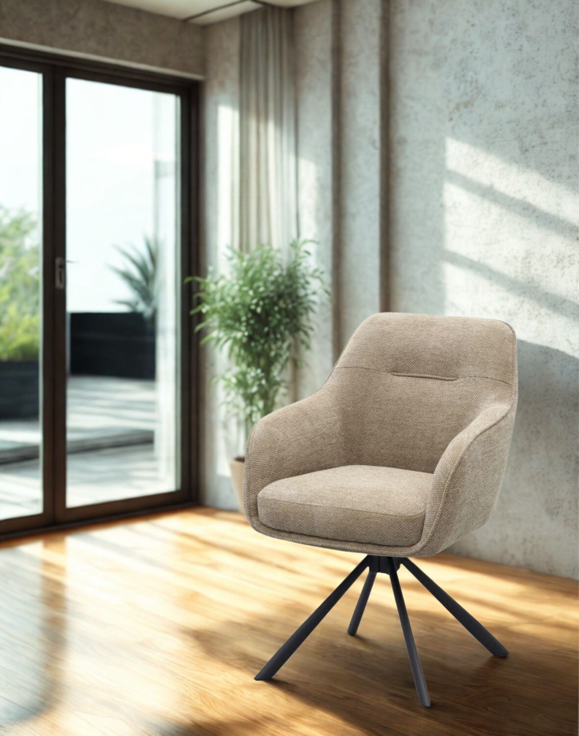 Scaunul de dining pivotant Avola, în chenille taupe și cu picioare metalice, de la Unique, este o piesă de mobilier elegantă și funcțională care combină designul clasic cu funcționalitatea modernă.