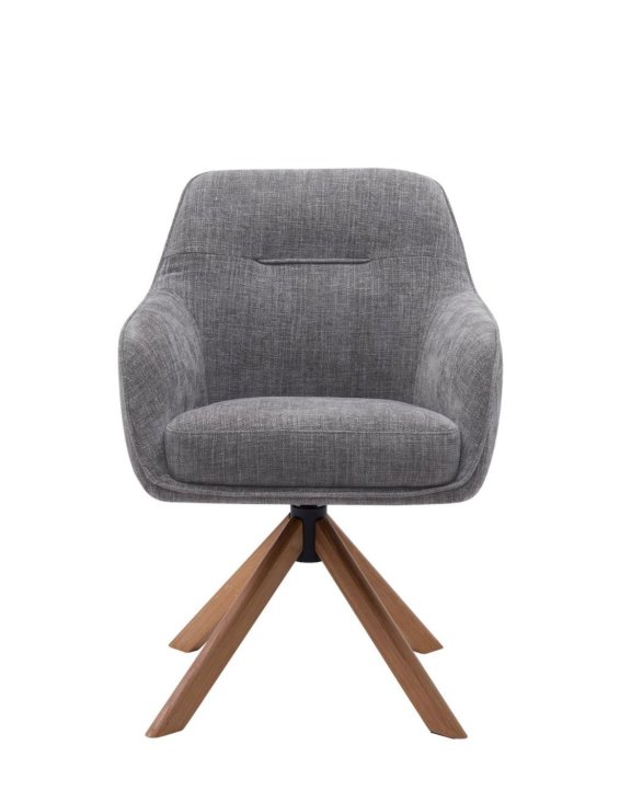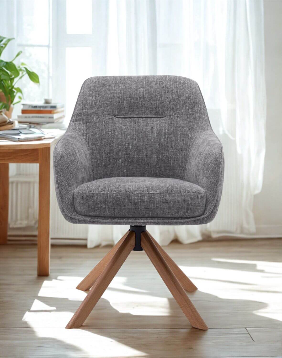 Scaunul de dining pivotant Avola, în gri și cu picioare din lemn, de la Unique, este o piesă de mobilier elegantă și funcțională care combină designul clasic cu funcționalitatea modernă.