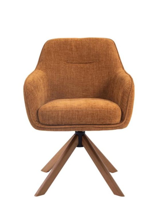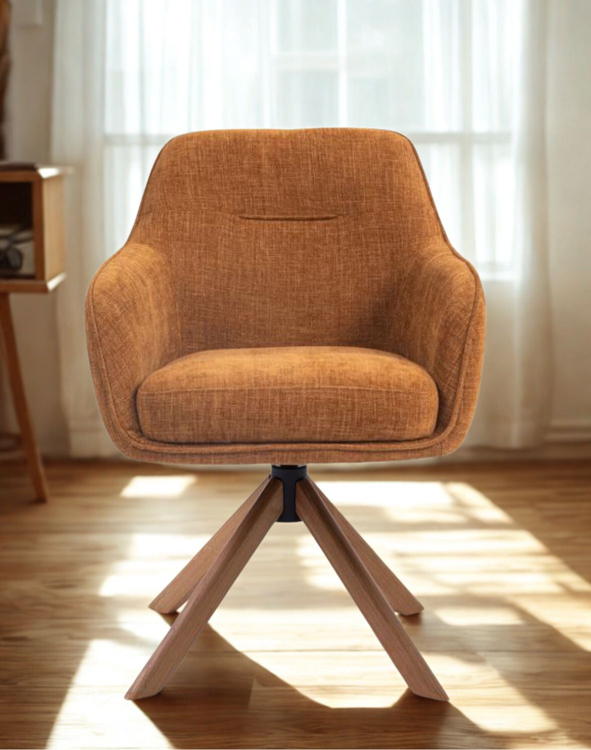 Scaunul de dining pivotant Avola, în culoarea scorțișoarei și cu picioare din lemn, de la Unique, este o piesă de mobilier elegantă și funcțională care combină designul clasic cu funcționalitatea modernă.