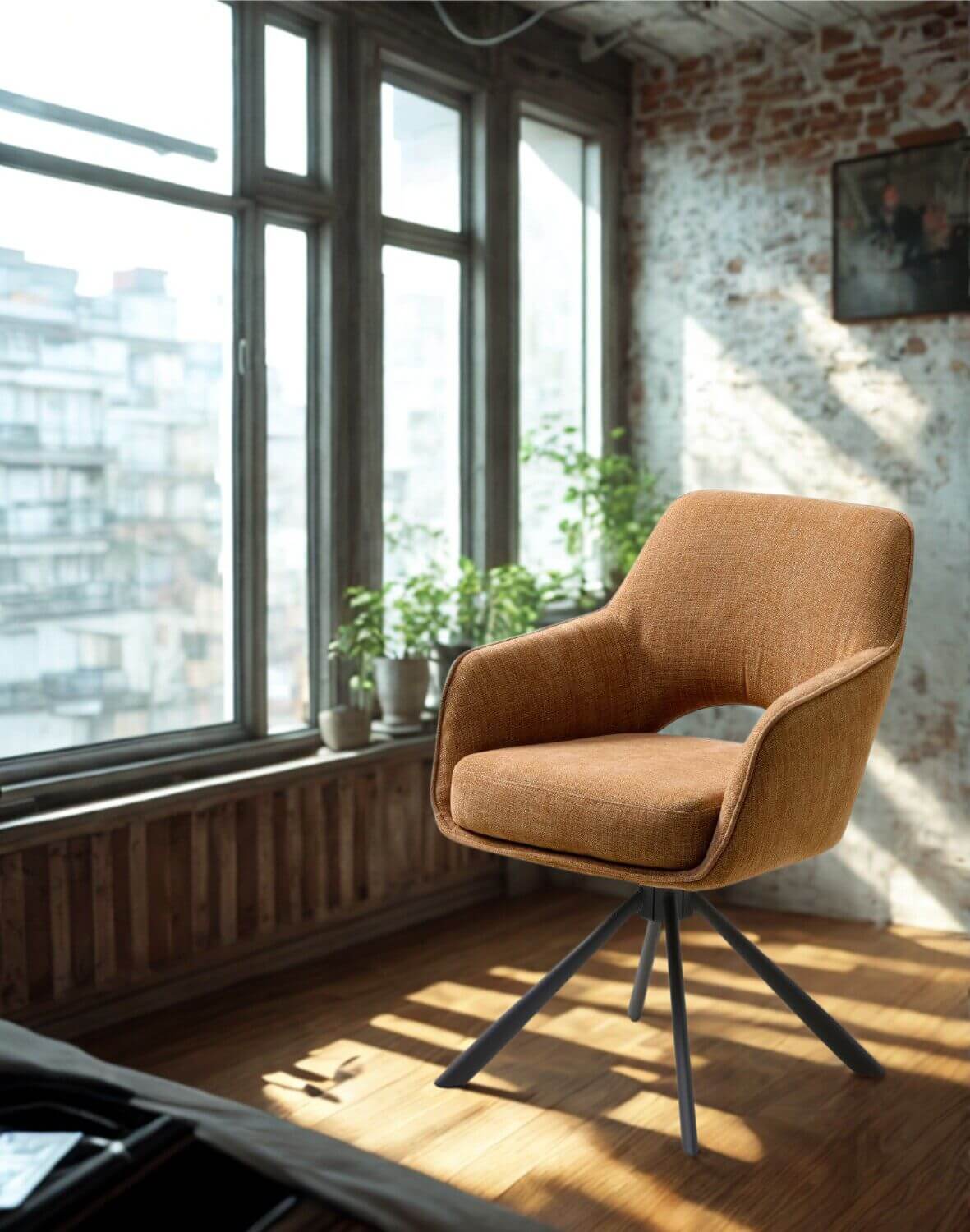 Scaunul de dining pivotant Cowley scorțișoară de la Unique este o piesă de mobilier elegantă și funcțională, care combină designul clasic cu soluțiile moderne.