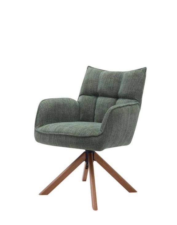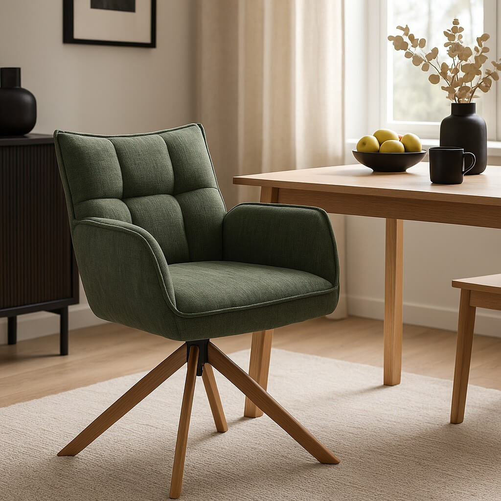 Scaunul de dining pivotant Marilla verde, cu picioare din lemn, de la Unique, este o combinație inovatoare între design elegant și confort în utilizare.